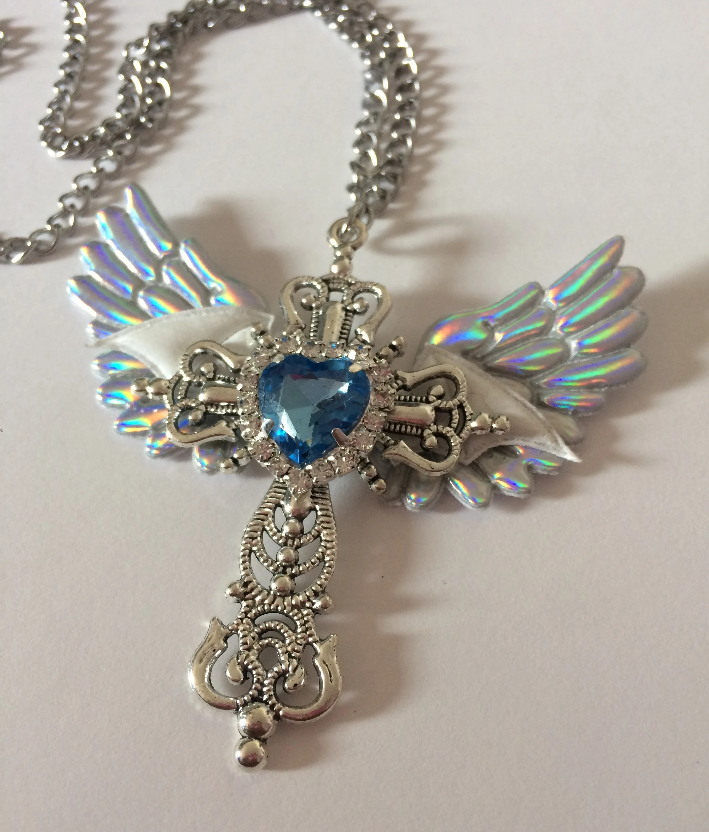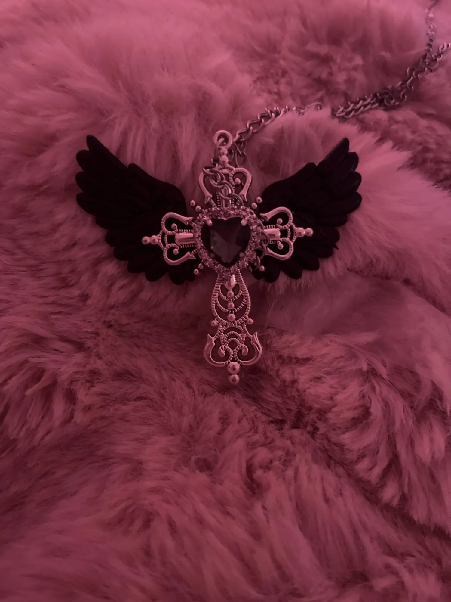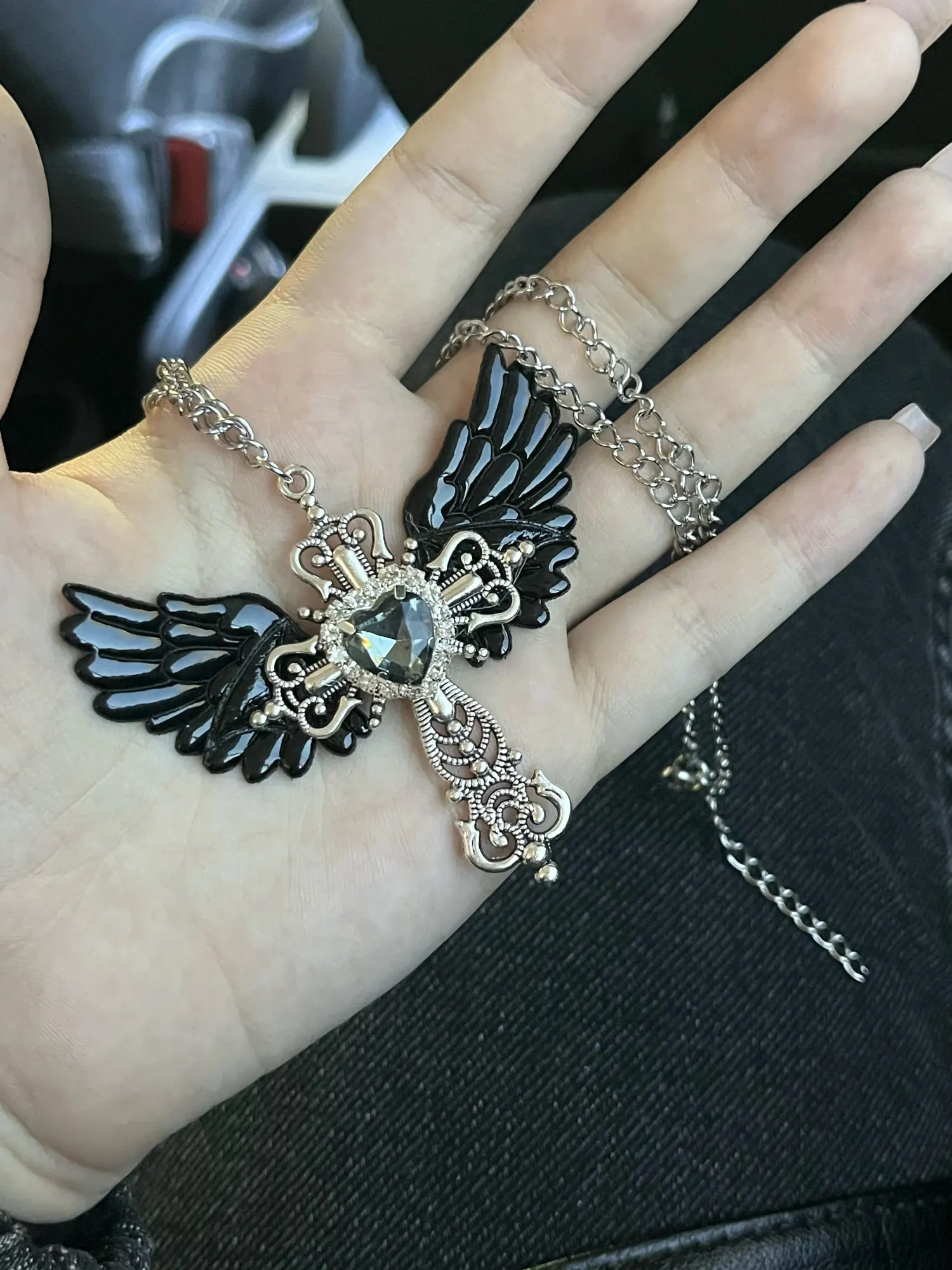I love my necklace!! The cross itself seems sturdy, the cross pendent also doesn’t move, it stays idly in the middle. Besides that the wings and heart are hot-glued. The wings on the necklace are made out of a holographic plasticy fabric, and the bat wings are from a plastic-esque puffy material, the same as the wings. My necklace wings came in a bit wonky but from afar it doesn’t seem bad. The chain doesn’t seem as high quality as i expected, it seems if i snagged the necklace it might snap.