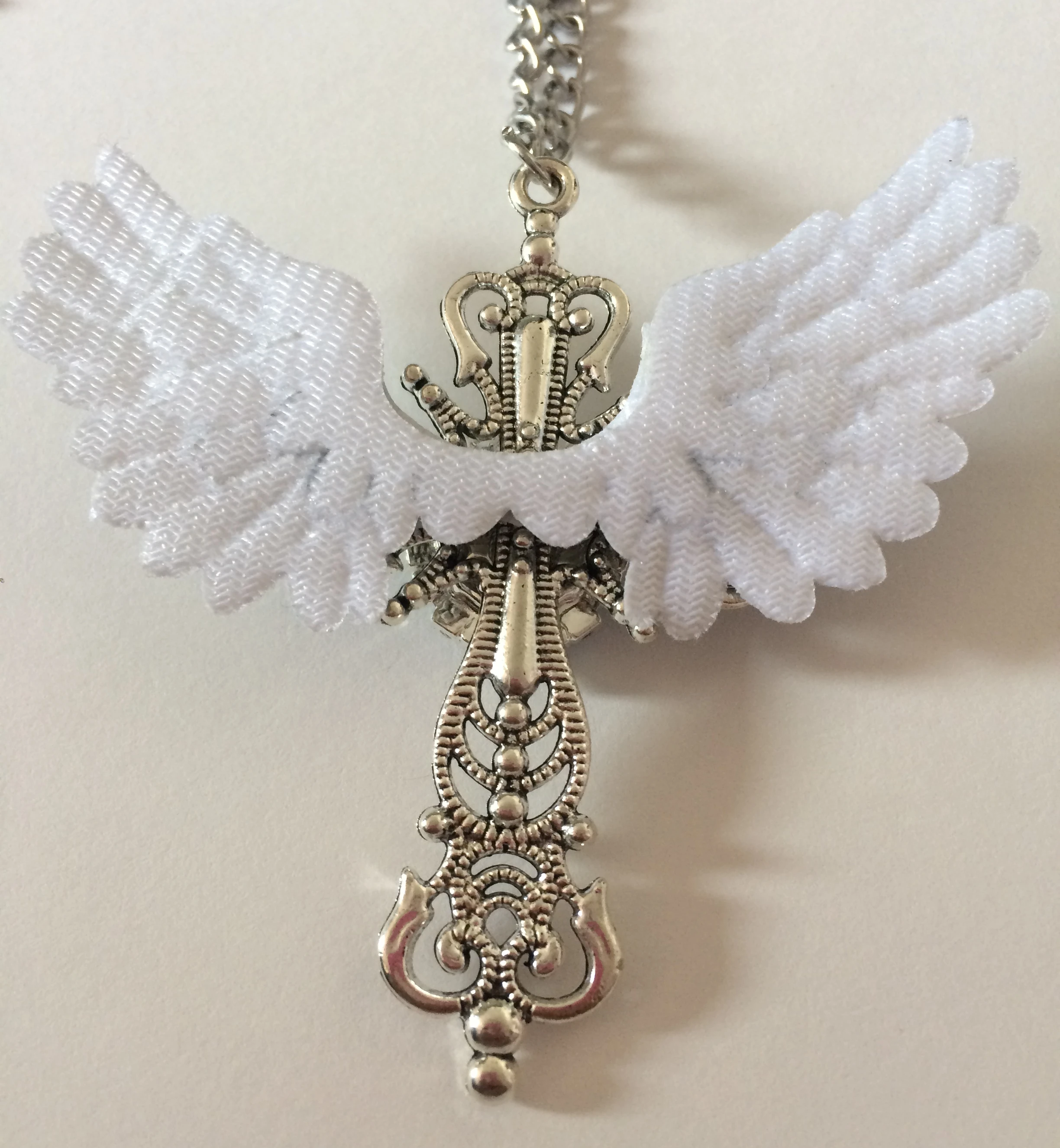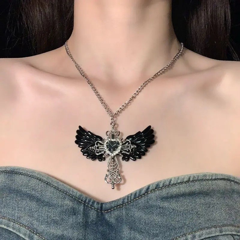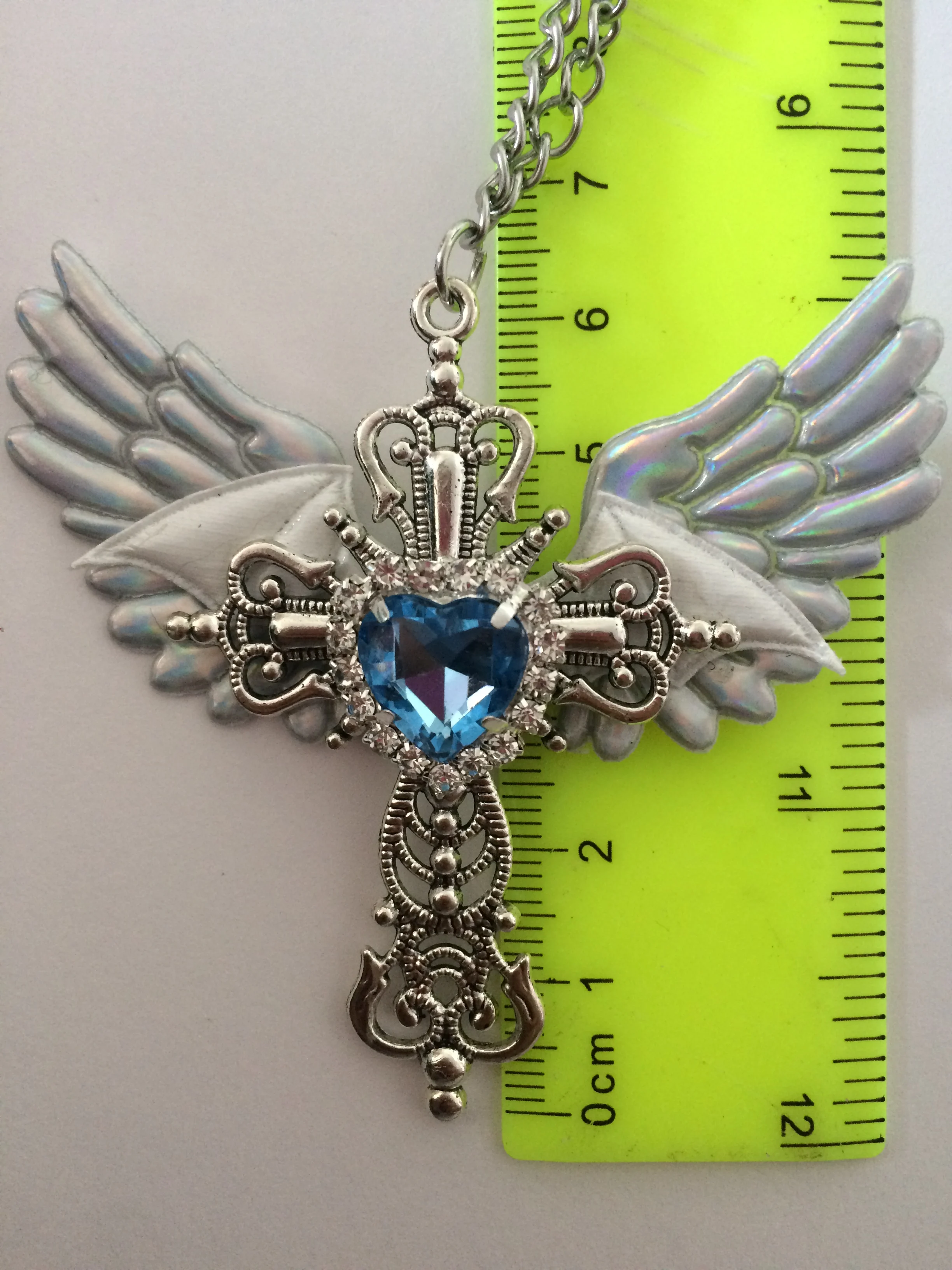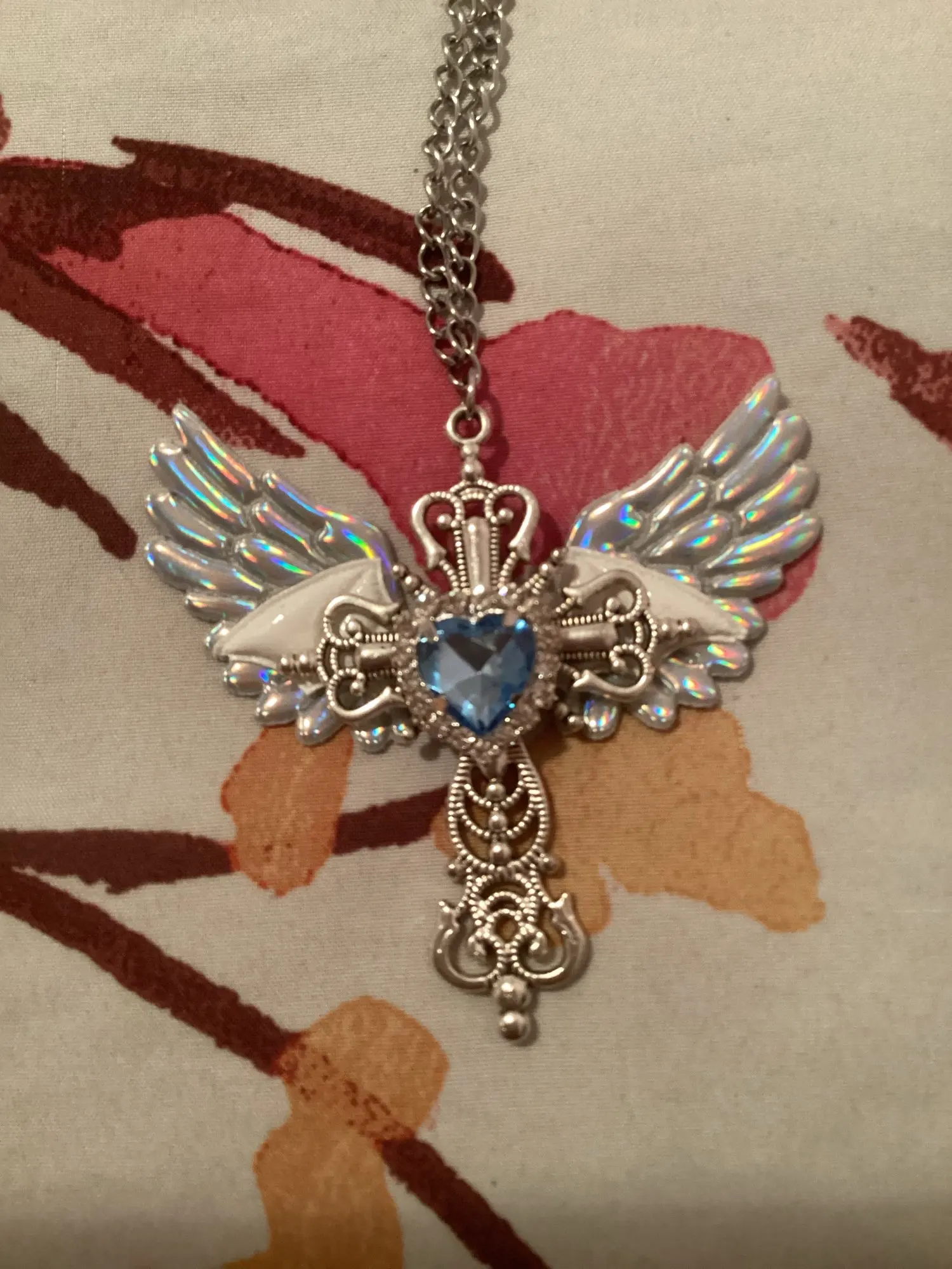 I love my necklace!! The cross itself seems sturdy, the cross pendent also doesn’t move, it stays idly in the middle. Besides that the wings and heart are hot-glued. The wings on the necklace are made out of a holographic plasticy fabric, and the bat wings are from a plastic-esque puffy material, the same as the wings. My necklace wings came in a bit wonky but from afar it doesn’t seem bad. The chain doesn’t seem as high quality as i expected, it seems if i snagged the necklace it might snap.